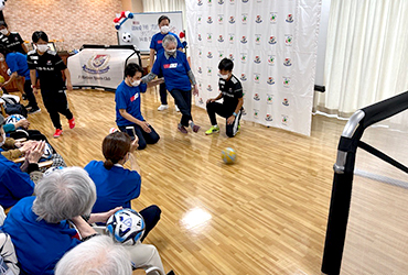 しかし、である。実際には簡単なストレッチから始まり、最後にはなんと参加者の皆さんがボールを蹴ってシュートする運動も実施された。しかも、その中には100歳の方もおられ、しっかりとゴールを決められていたというのだから驚きだ。これには「こんなこともできるんだ、と衝撃でした」と大胡施設長。同じく驚いたという斎藤コーチは「サッカーというツールを通して年齢も、置かれている状況も関係なく距離を縮められることをあらためて実感することができました」と話すとともに、そういったシーンや参加者の皆さんの笑顔に触れて「むしろ僕たちがパワーをもらいました」という感謝の言葉も聞かれた。