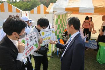 2023年10月28日より行われた「ねんりんピック愛顔のえひめ2023」では、開会式当日にイベントブースを出展し、当社のサービス紹介、体成分分析装置「InBody」で筋肉量・基礎代謝などを測定するコーナーや、VRを使用した認知症体験コーナーを設置し、300名を超える来場者に体験いただきました。また、選手の皆さまを応援する気持ちを込めて先着1,000名様へプロテインバーをプレゼントいたしました。